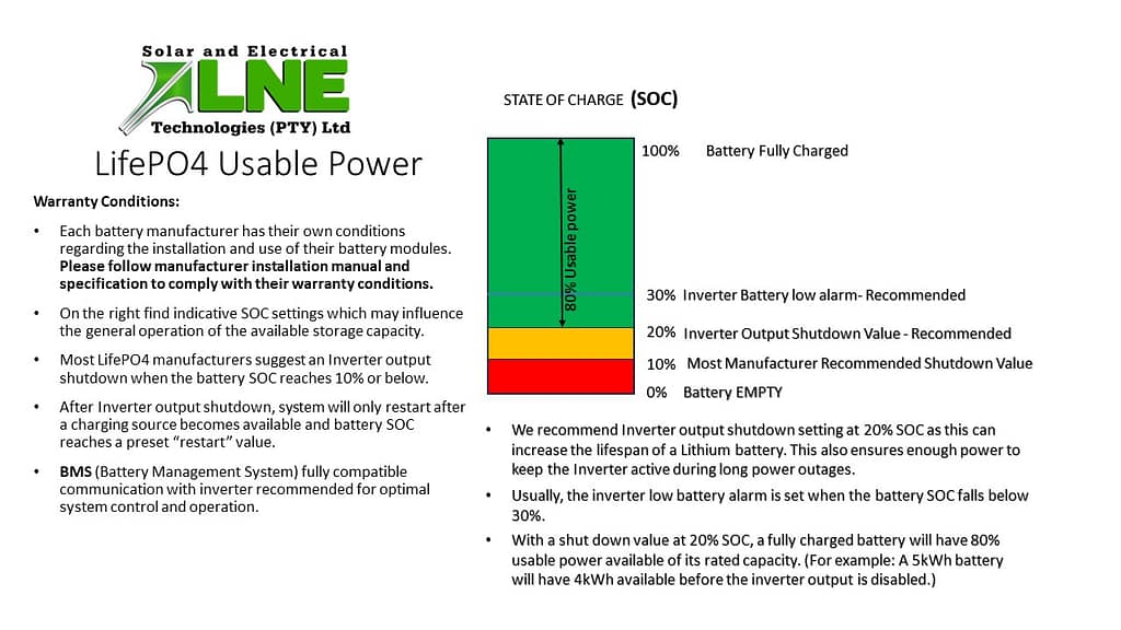 With a shutdown value at 20% SOC a fully charged battery will have 80% usable power available of its rated capacity. (For example: a 5-kWh battery will have only 4kWh of Power available before the inverter output is disabled)