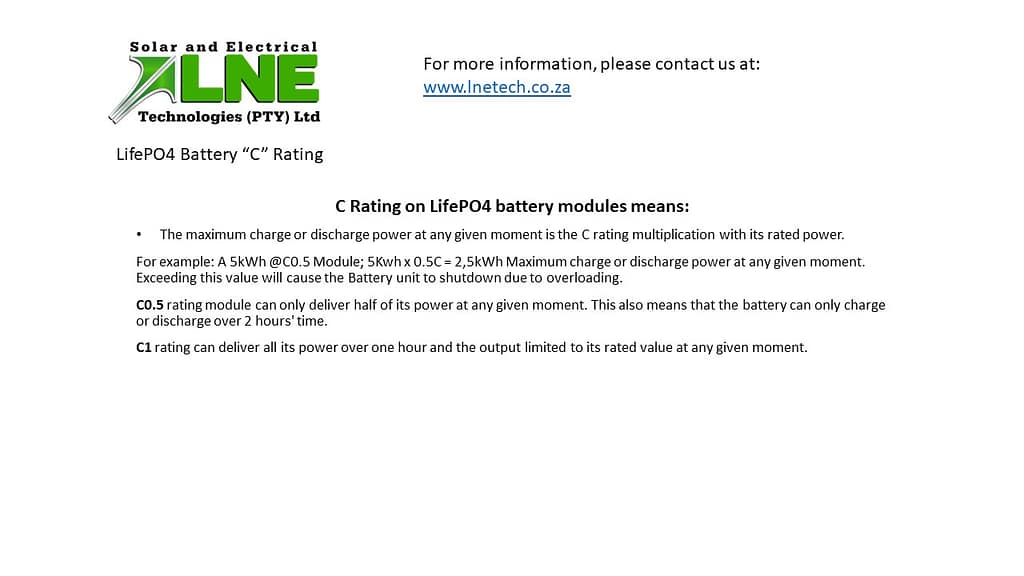 A 5 kWh battery at C 0.5 is; 5-kWh multiply with 0.5 C thus the maximum charge or discharge power at any given moment is 2.50kWh. Exceeding this value will cause the unit to shut down due to overloading. A 0.5 C rating module can only deliver half of its power at any given moment.
